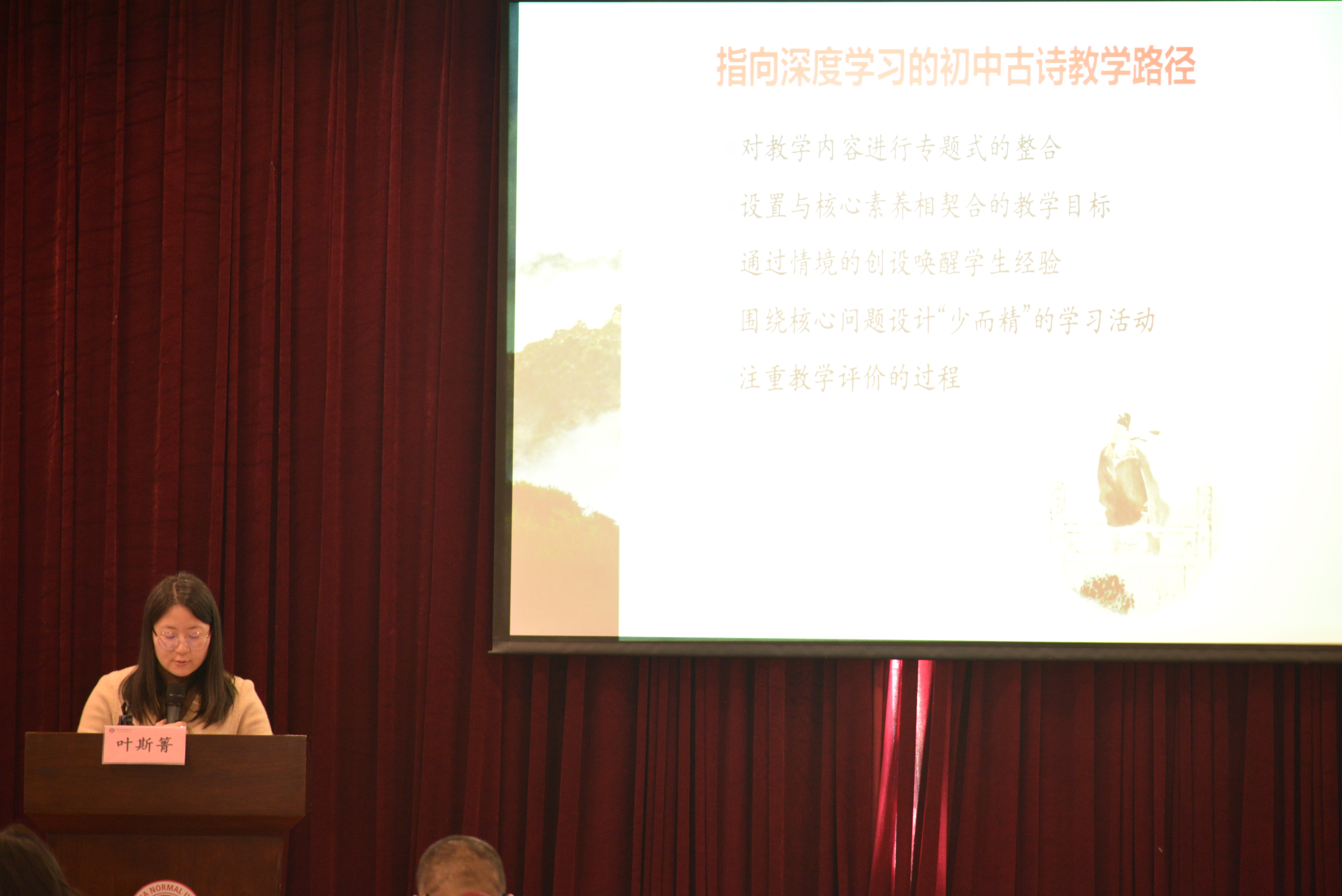 上海市建平西校的叶斯箐老师分享了自己关于古诗词教学的探索,她的论文题目是《指向深度学习的初中古诗教学路径刍议——以登高题材为例》。她提出,在“双新”背景下,基于深度学习的内涵和策略,古诗词教学可以尝试对教学内容进行专题式的整合,设置与核心素养相契合的教学目标,通过情境的创设来唤醒学生经验,围绕核心问题设计“少而精”的学习活动,注重教学评价的过程等,以此解决现实教育中浅、碎、杂的问题,让古诗词教学真正回归丰富情感体验、滋养生命厚度的本质。