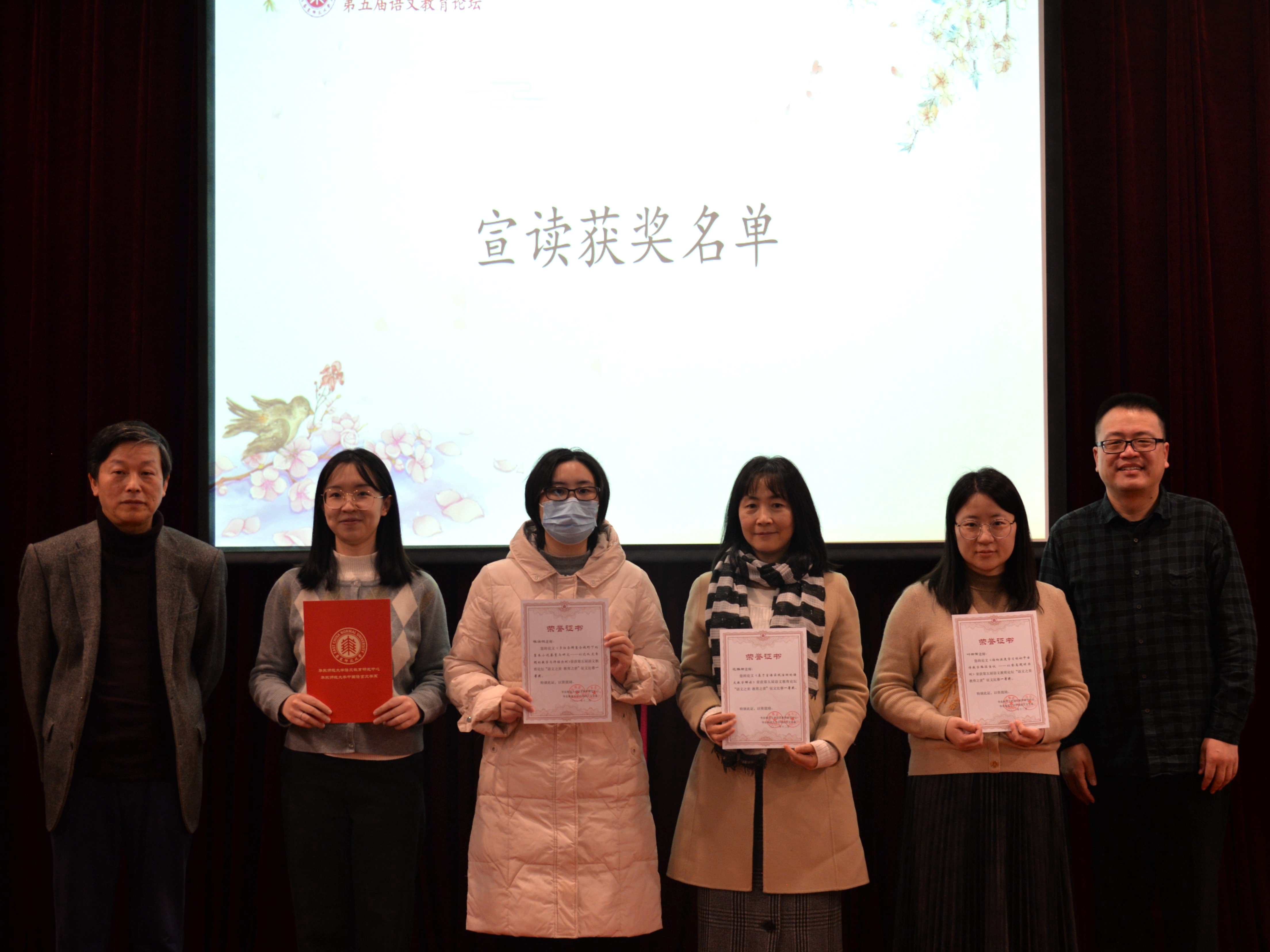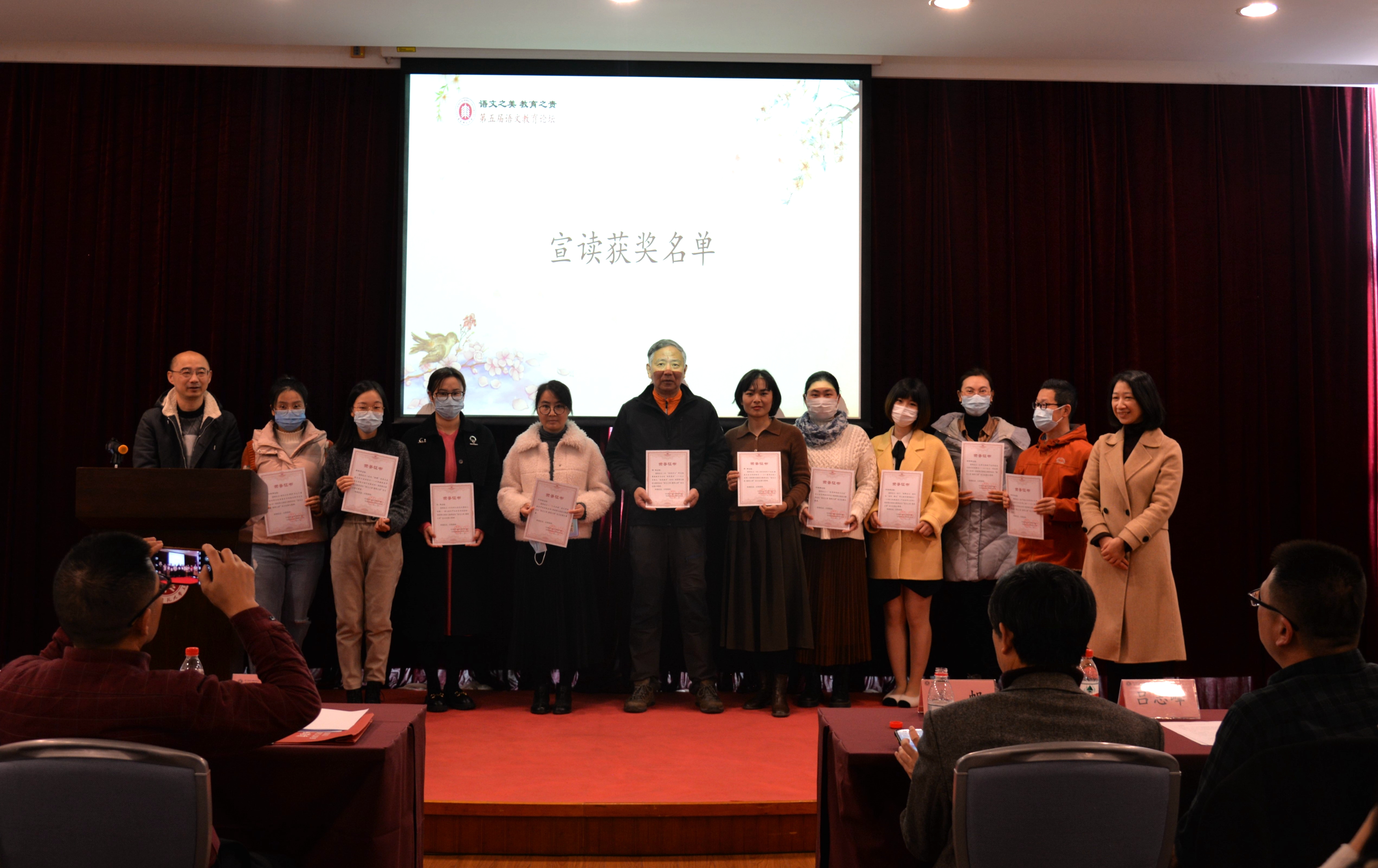王意如教授宣布第五届语文教育论坛征文比赛获奖名单,谭帆、吕志峰、曹刚、郑桂华、薛峰、叶丽新等分别为获奖教师颁奖。本届征文比赛共收到来自上海、北京、重庆、福建、河北、江苏、浙江、山东、安徽、湖北、江西、青海、广东等13个省市论文共167篇,经市教研员、高校和中学语文教育专家匿名评审,评选出一等奖11篇,二等奖22篇,三等奖30篇。获奖论文聚焦深度学习、大单元教学、整本书阅读等语文教学热点问题,依托理论打开研究视野,结合具体教学经历进行分析与反思,旨在切实提高学生的阅读思考能力与核心人文素养,体现了当下语文教育工作者最新的思想动态与工作成果。
