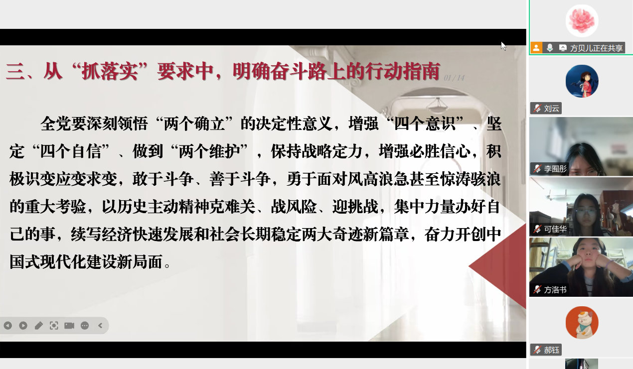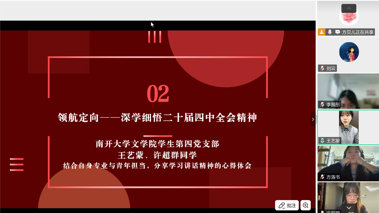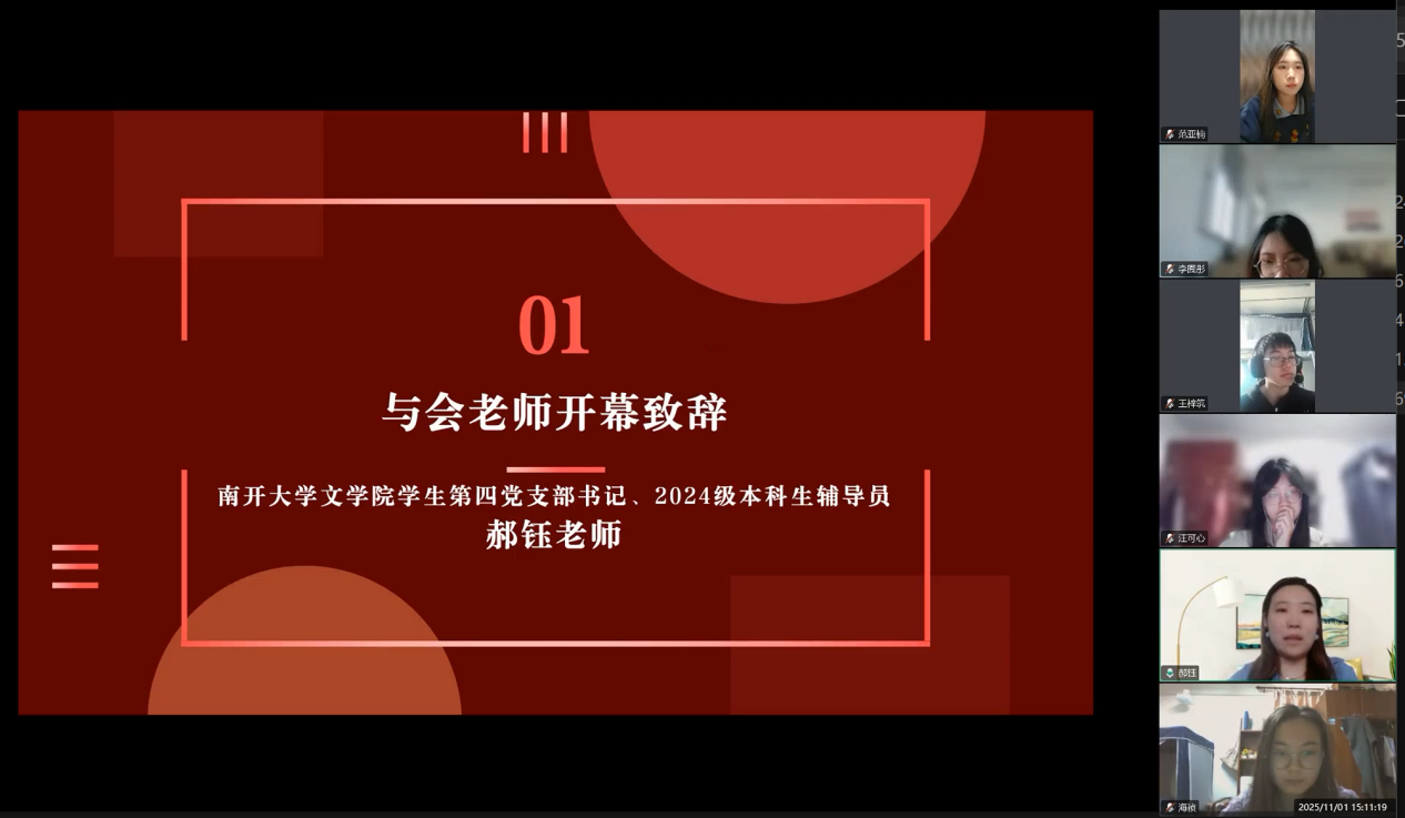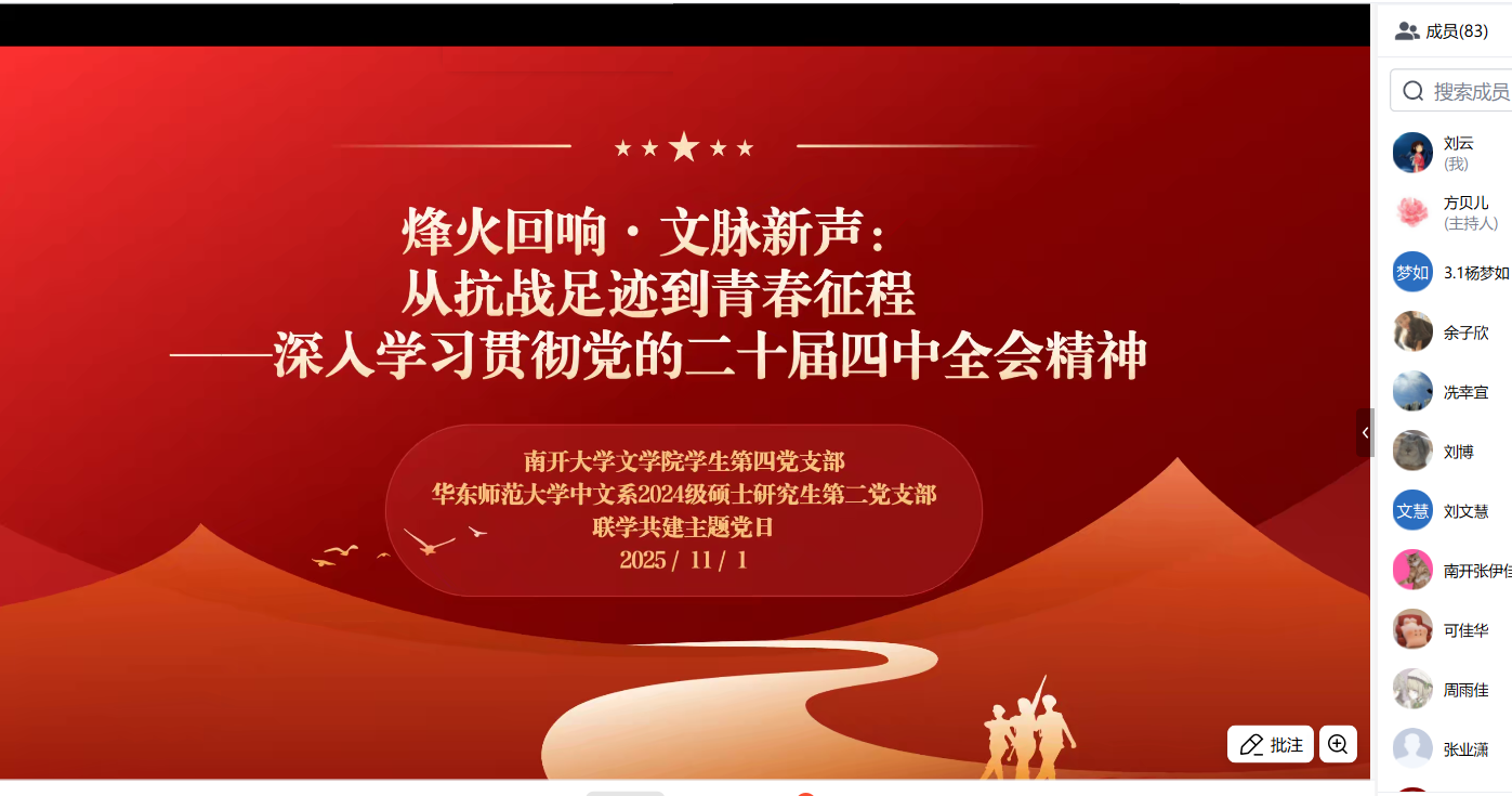 为深入学习贯彻党的二十届四中全会精神,传承红色校史基因,激发新时代青年党员的历史自觉与使命担当,2025111日下午,体育博彩网站 2024级硕士研究生第二党支部与南开大学文学院学生第四党支部以“烽火回响・文脉新声:从抗战足迹到青春征程”为主题,通过腾讯会议线上开展联学共建主题党日活动。两校近百名党员齐聚“云端”,在回望历史、共学精神中凝聚青春力量。