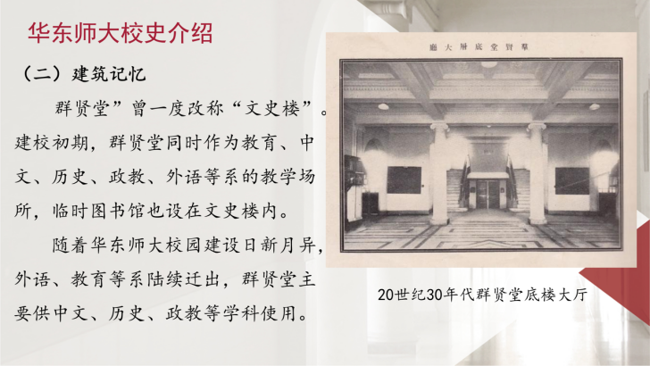 体育博彩网站 2024级硕士生第二党支部组织委员陈玲同学以“群贤堂”为线索,串联起了老华东师大人的爱国故事,讲述华东师大的红色基因她介绍,1951年学校在大夏大学、光华大学等基础上组建,成为新中国第一所社会主义师范大学。建校初期,“群贤堂”(曾称“文史楼”)是中文、历史等系的教学场所,也见证了“求实创造,为人师表”校训精神的传承。2004群贤堂被列为文物保护单位,如今仍是我们感受校史温度的重要载体。”配合校史老照片与短视频,陈玲的分享让“师范报国”的初心更加具象也带给与会同学们更加鲜活生动的感受。