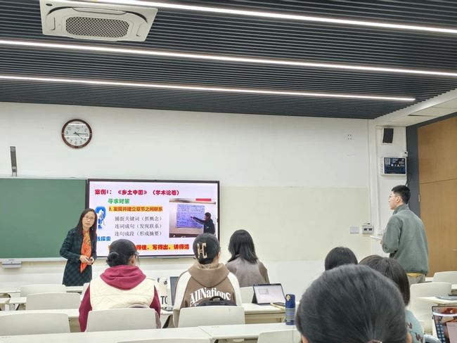 在交流环节,有同学提出了关于整本书阅读教学重点的问题,特别是如何平衡书籍内容和阅读方法。白丽老师作出解答,教学目标不仅仅是方法和策略的引导,更重要的是价值引领。她强调了选择特定书籍进行教学的重要性,不仅仅是因为它们的阅读方法,而是因为它们在文化和价值上的选择和判断。她以《乡土中国》为例,探讨了为什么选择这本书作为教学材料,以及如何从民族角度考量文学文化遗产的重要性。
