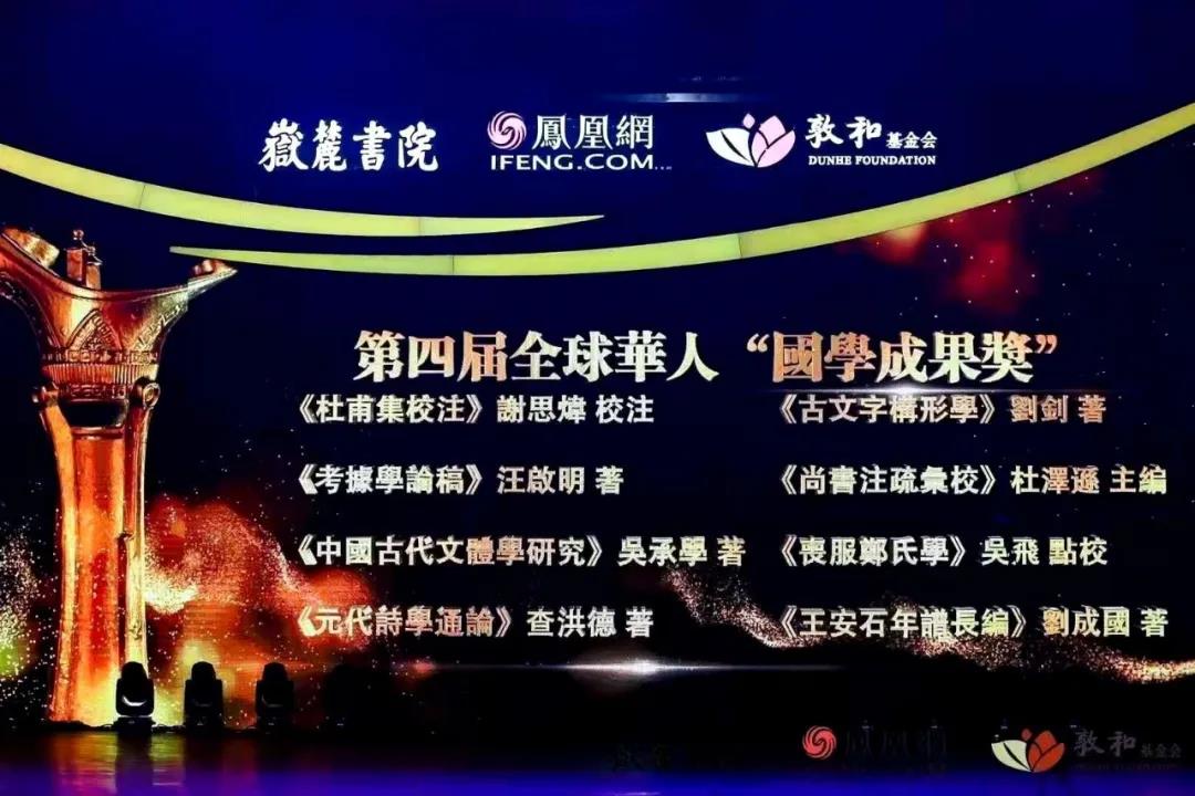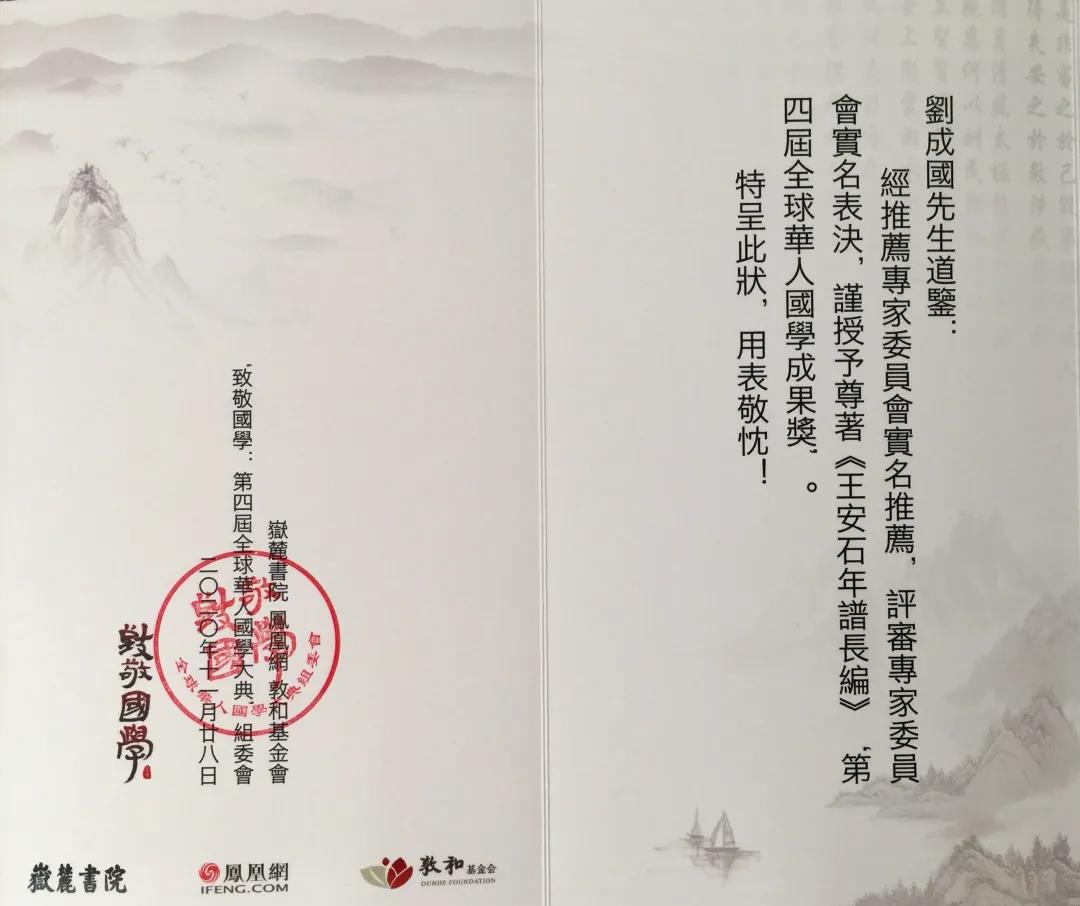 11月28日,由岳麓书院、凤凰网、敦和基金会联合主办的第四届全球华人国学大典颁奖典礼在北京盛大举行,我系古籍研究所刘成国教授的《王安石年谱长编》荣获第四届全球华人国学成果奖。