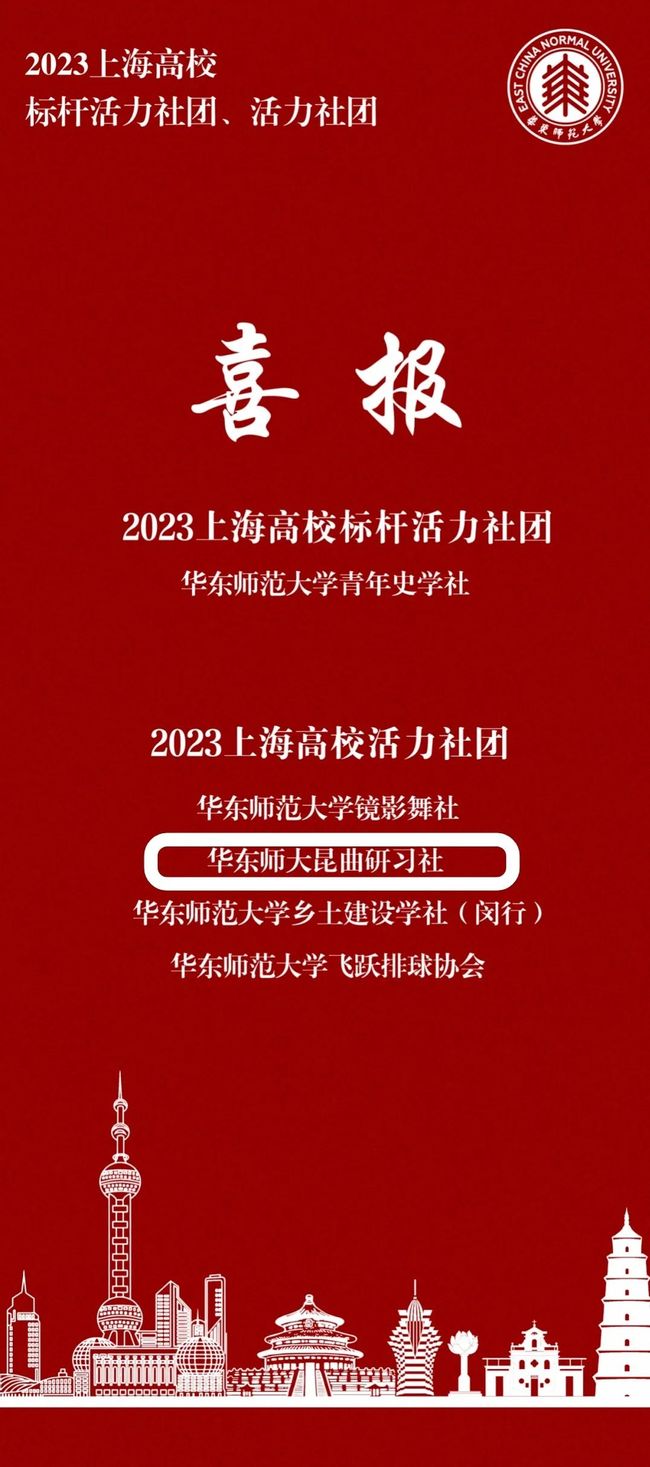 树立典型,弘扬先进。经共青团上海市委员会、上海市教育委员会决定,体育博彩网站 共有1家社团被授予“标杆活力社团”称号,4家社团被授予 “活力社团”称号。其中,由体育博彩网站 指导的昆曲研习社被授予“活力社团”称号。