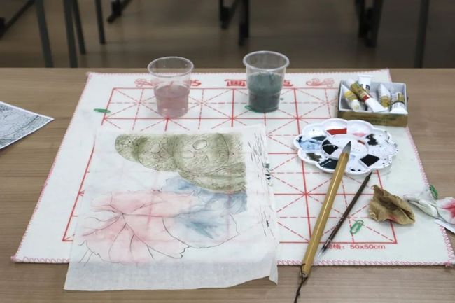 活动伊始,陆老师向大家介绍了国画的种类,国画可分为写意画和工笔画两种,写意画用生宣或半生宣进行作画,工笔画则需要用到熟宣,熟宣表面洒了云母,让墨和色不易洇散开。陆老师也讲解了需要用到的三支笔:勾线笔、色笔和水笔,每支笔都担任着重要的角色。同学们听得津津有味,迫不及待想要开始学习画工笔南瓜。