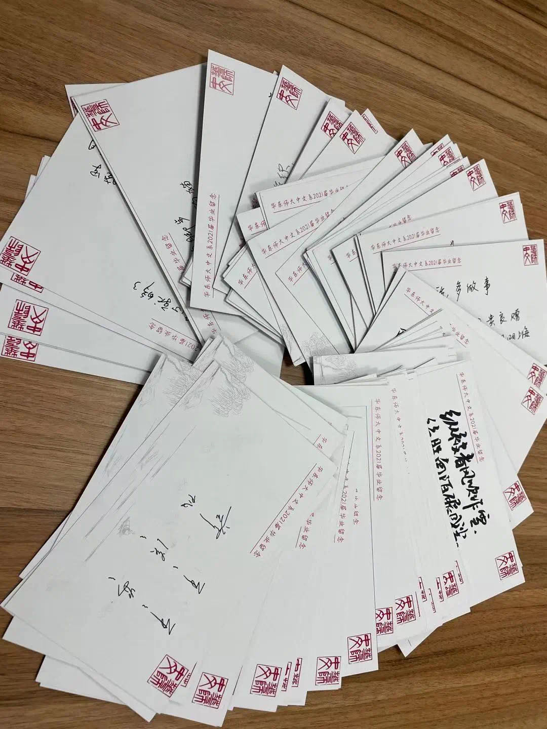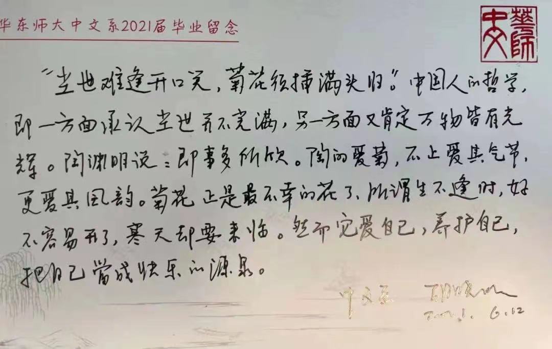 毕业典礼上,体育博彩网站 还为毕业生们准备了一份惊喜。在学位授予仪式进行的同时,毕业生随机抽取写有教师毕业寄语的明信片信封,明信片正面印有校园的风景或人物、可爱的动物,背面有体育博彩网站 众多老师们的寄语,则风趣而隽永,让毕业生们有抽盲盒般的惊喜与感动。比如胡晓明老师的寄语“我十五岁离家到外地去当工人,想妈妈想得晚上躲进被子里悄悄地哭了。妈妈给我每周写信,渐渐地在通信来往中,在妈妈给我推荐的诗歌和小说中,找到了解脱的办法。所以,我有两个妈妈,一个是现在的妈妈,一个是中文的妈妈。祝你永远有中文的妈妈相伴”;方笑一老师的寄语“华东师大前身是大夏大学,请记住‘大夏’的英译:Great China”;徐默凡老师的寄语“体会这世界的复杂性,和更多的心灵共情”,他的《非官方的毕业致辞》一文也早就在朋友圈中“刷屏”;还有汤拥华老师的“感谢你慷慨地与我们分享青春”,情怀满分。