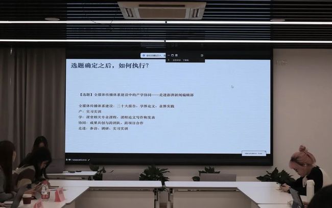 复旦大学新闻学院硕士生丁超逸同学结合由他主持的《全媒体传播体系建设产学协同——走进澎湃新闻编辑部》项目分享经验。他认为,在选题上要推进产学研一体化,在实践中要积极参与一线实习和跨团队合作,在优势突出上要学会抓亮点、抓趋势、抓特征。