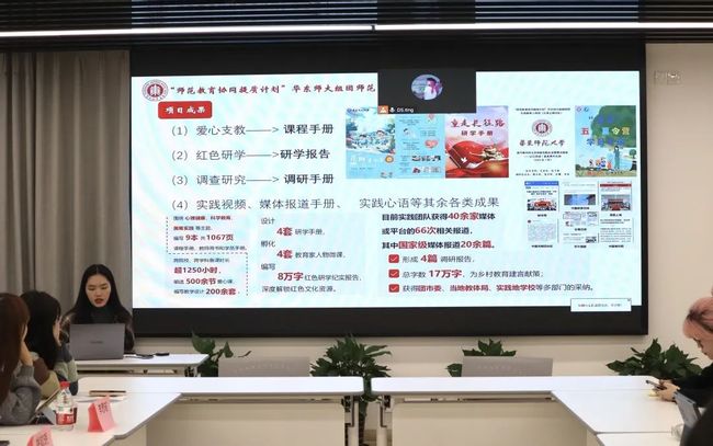 华东师大“师范教育协同提质计划”项目代表张弸秀雨同学,从乡村支教、红色研学、调查研究三个方面入手,介绍了她在今年暑期参与的“师范教育协同提质计划”实践活动,分享了他们在“挑战杯”红色专项比赛和“知行杯”比赛中取得的成果与经验。