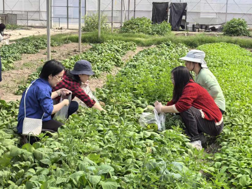完成手作体验后,老师们走进绿意铺展的采摘区,俯身田垄之间,亲手采摘果蔬。温室里光线明朗、空气清新,成片青翠蔬菜生机勃勃,大家或两三结伴、或轻声交流,一边辨认成熟果蔬,一边分享采摘心得。大家在劳动中体会收获的喜悦,在春色中感受自然疗愈的力量。