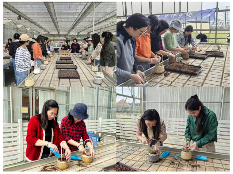 活动伊始,大家首先开启了多肉手作环节。在温室里,老师们戴上手套,围坐操作台前,认真挑选形态各异、色彩清新的多肉植株,学习配土、栽种、定型与装饰技巧。小巧精致的花篮容器、柔和细腻的配色搭配、错落有致的造型设计,让每一件作品都兼具自然气息与个人审美。经过亲手设计与细致摆放,一盆盆别具匠心的多肉作品逐渐成形,既承载着春日生机,也寄托了大家对美好生活的热爱。
