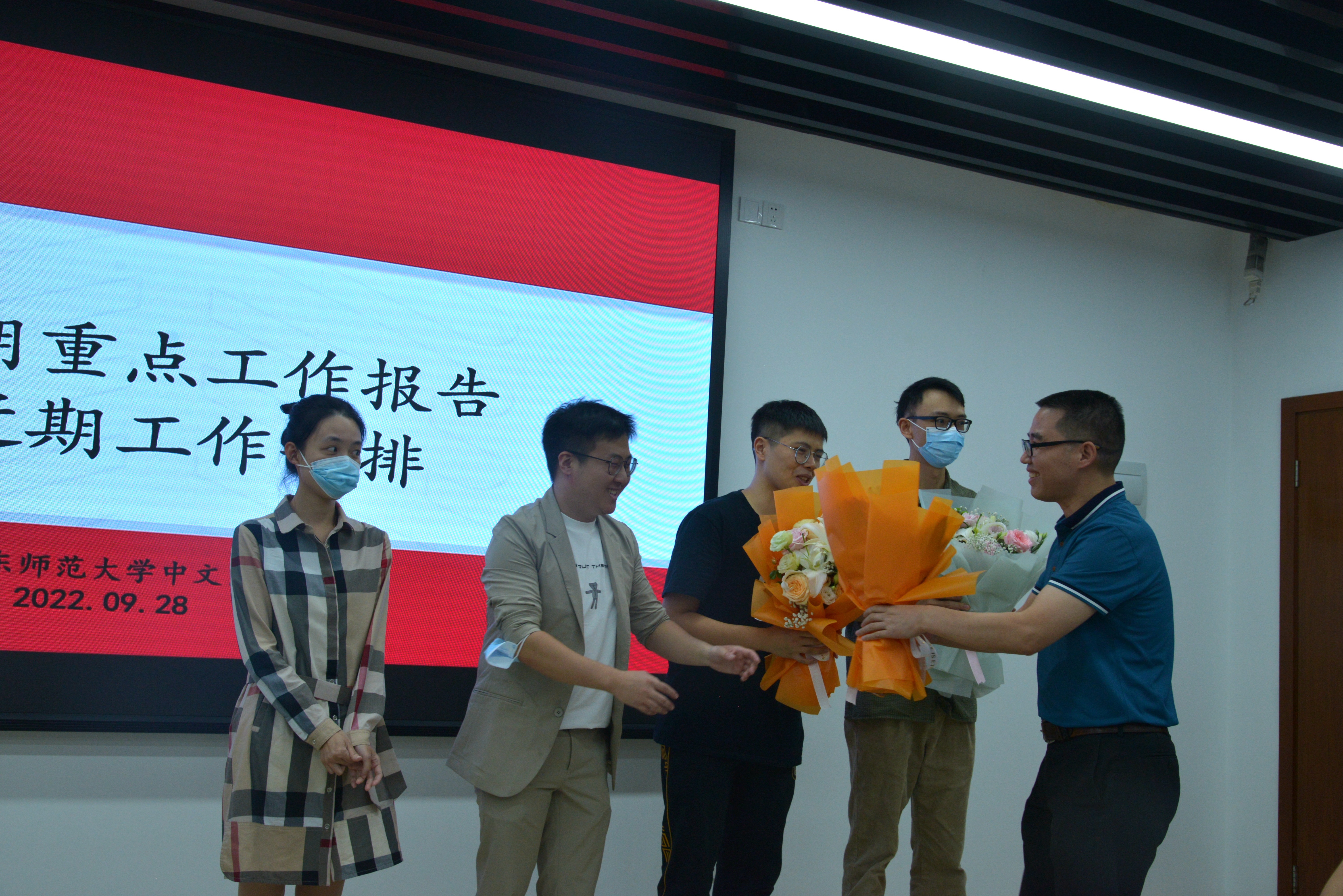 9月28日下午1:00,体育博彩网站 工会利用全系教职工大会召开的机会,为今年适逢整十生日的教工举行集体庆祝活动。文贵良主任为他们献上鲜花,表达祝贺之意。系工会还为他们准备了蛋糕,并在教职工大会后与大家一起分享。