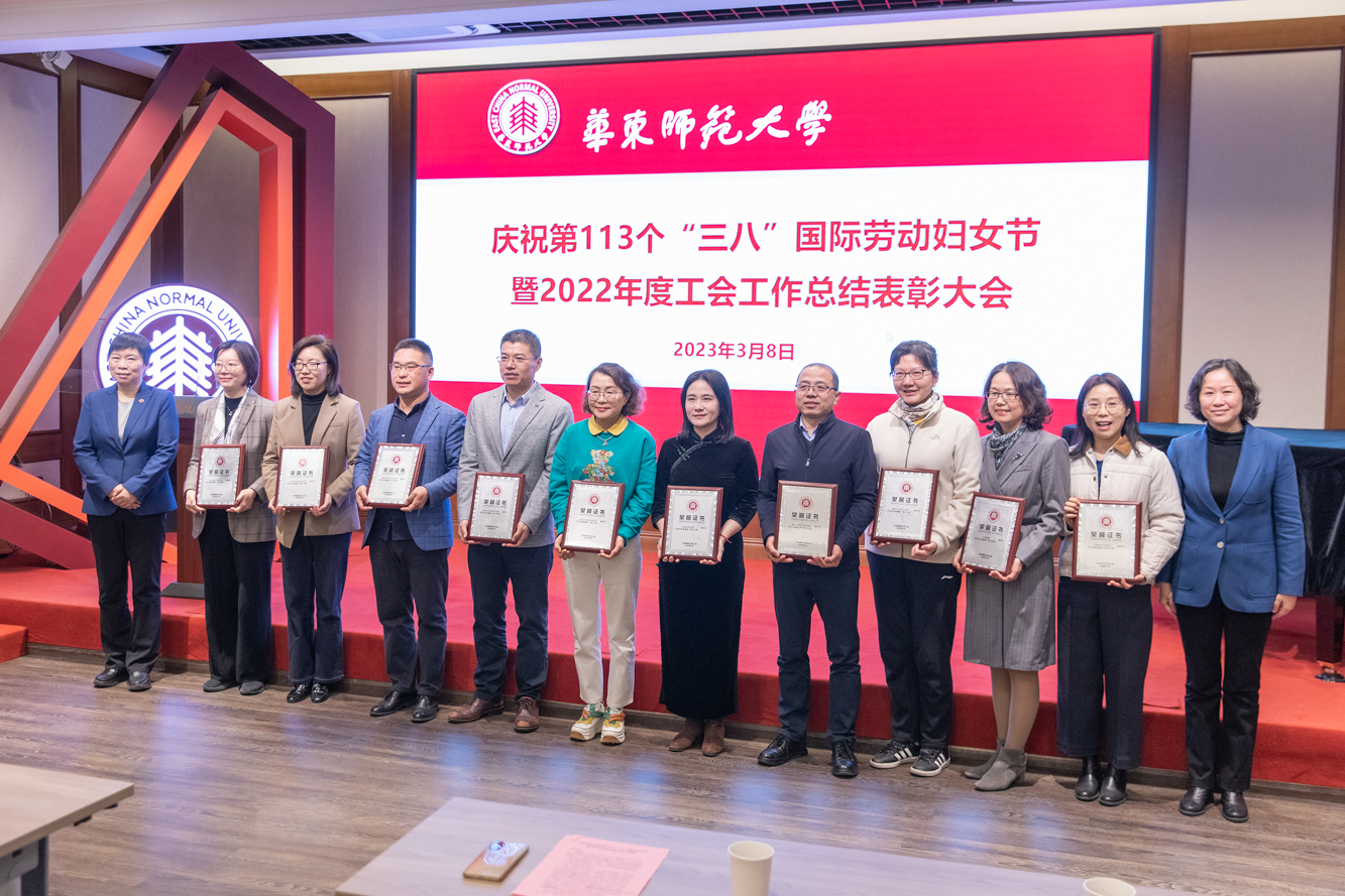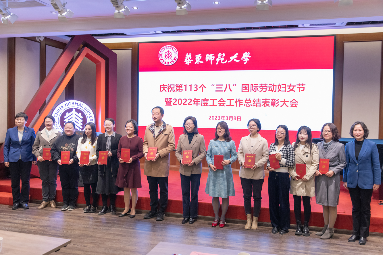 3月8日上午,华东师大庆祝第113个“三八”国际劳动妇女节暨2022年度工会工作总结表彰大会在普陀校区工会一楼多功能厅举行。校工会两委委员,妇委会委员、各部门工会主席以及获得各类荣誉称号的先进个人和先进集体代表70余人参加了表彰会。校领导杨昌利、程静出席会议,并为获奖个人和单位颁奖。