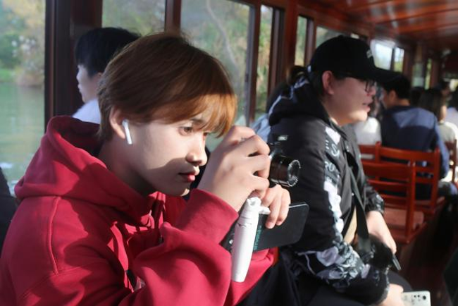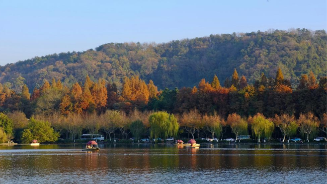 杭州之行正是从西湖开始,下车后同学们踩着树梢间洒落的细碎光影,悠然走到了乘坐游船的渡口处。等船缓缓开动起来,西湖美景也愈发生动的跃入眼帘。清风如酒,波纹如绫,满湖碧波荡漾着天光云影。遥想当年,张岱乘小舟一芥往湖心亭观雪,但见雾凇沆砀、上下一白;而今值此暖冬十二月,只见环湖的三面群山层林尽染、树树秋色,明黄、茶褐泼洒在湛蓝的天幕上,倒也别有番情致。