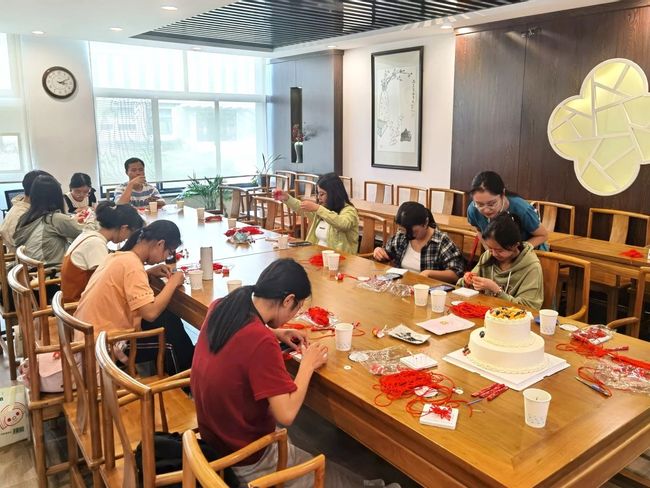 活动伊始,组织人方贝儿同学向大家介绍了中国结的编织手法、象征寓意,通过展示不同形态的中国结,让大家感受到中国传统文化的魅力。在“挑一压一、挑三压一、挑二压一……”的口诀声中,与会同学们共同学习了中国结的编法。尽管编织过程略显繁琐和困难,稍不留神就容易出“岔子”,但大家兴致勃勃,互相帮助指导,最终,一个个赋予美好愿望的中国结呈现在大家面前。