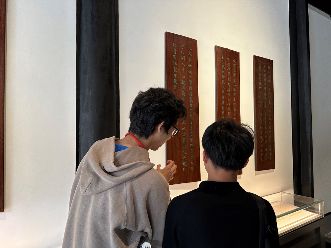 沈园中蕴含的历史细节频频触动着喜爱中国古代文学的同学们。“岩前聚首勿相忘。——猜古籍一”,这类有趣的谜语在沈园处处可见,引得同学们三两讨论,著名的《钗头凤》碑也让同学们长久驻足观赏,令人感叹即使是熟悉的史料,实地寻访一番过后也会有别样的感受。之后,同学们参观了陆游纪念馆,通过对陆游的手迹、碑刻和拓片等史料的研读,对这位爱国词人的认识更进一步。
