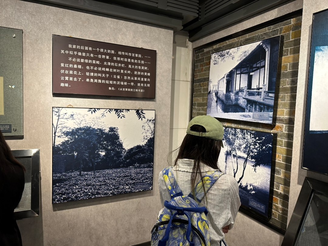“横眉冷对千夫指,俯首甘为孺子牛”,鲁迅纪念馆的入口立着鲁迅先生的雕像,配以《自嘲》中的名句,立刻使同学们在中国现代文学史课堂上所接触的鲁迅形象鲜活了起来。在纪念馆主展厅,从百草园到三味书屋,从南京洋务学堂到留学日本,从经历家庭破落的磨难到最终投身革命事业,鲁迅56年的生平事迹被一一展现。其中既有影响其一生的重大事件,也有水乡社戏等生活细节的再现。“只要能培一朵花,就不妨做做会朽的腐草……”,鲁迅对青年的热切指引无不令在场同学深受感染,在文学中体悟革命精神。