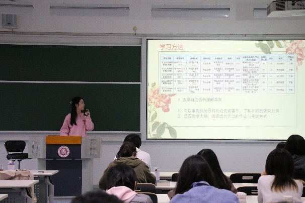 随后,刘楚戈分享了中国古典文献学的学习经验,从自身访书与古籍整理的实际经历出发,为本科同学们介绍了古典文献学的“冷板凳”功夫,从多方面为学弟学妹们推荐课程、提供建议。尚倩倩结合自己的科创项目“敦煌存调名佛教曲子词研究”,系统而细致地讲解了从组建队伍到成果撰写的思路与方法,为同学们打造内容丰富、格式精准、逻辑清晰的科创成果提供了要点。吴思燕谈及自己在汉语言文字学和论文写作上的经验,从《古代汉语》课程的学习方法出发,引申并推荐了汉语言文字学方向实用的网站与工具。她也以自己的学年论文《〈苍颉篇〉传世辑佚材料与简牍本对比研究》为例,分享了从选题到安排论文结构的方法技巧。唐艺琳结合自身的学习经历,从作者、作品、评价、线索四个角度梳理了《中国文学史》的备考方法,就中国古代文学方向推荐了阅读书目与网址工具,并提供了选择方向与选择导师的建议。