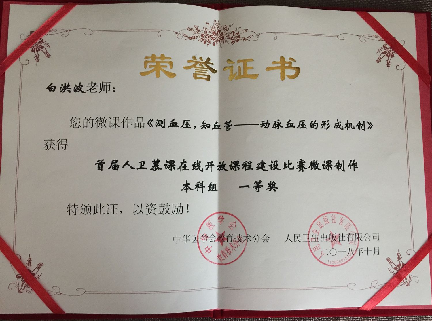 首届人卫慕课在线开放课程建设比赛由人民卫生出版社与中华医学会教育技术分会联合举办。比赛于2018年4月启动,8月底截止报名。本次比赛共有来自71所医体育博彩网站校的参赛作品675个,其中课程设计作品186个,微课489个。我校基础体育博彩网站选送白洪波、刘国辉老师的微课作品分别获一等奖、二等奖的好成绩。