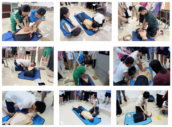 对人体理论基础和标本结构有了初步的认识后,同学们在玉烛协会志愿者示范下,逐步打开了深入理解人体心脏、肺脏结构和生理机能的大门。在分组练习中,同学们先后进行心肺复苏和运动损伤的急救技能培训。亲手实践心肺复苏、处理创伤、止血和包扎等紧急外伤情况的应对方法。