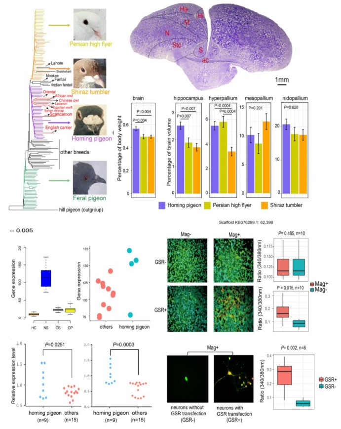 磁场对人体的作用由于其作用的长期性和不可感知性往往是被忽略的,并且难以研究。我院引进人才王树教授课题组联合昆明动物研究所吴东东教授、梁斌教授、伊朗科尔曼Shahid Bahonar大学Ali Esmailizadeh教授,利用信鸽作为模式动物,针对信鸽的地磁感应和归家行为特性,通过全基因组测序、比较基因组、转录组分析及功能研究,首次发现GSR基因在信鸽中受到正选择,其在信鸽可能的磁场感应部位如鼻瘤和视色素细胞层呈现高表达。