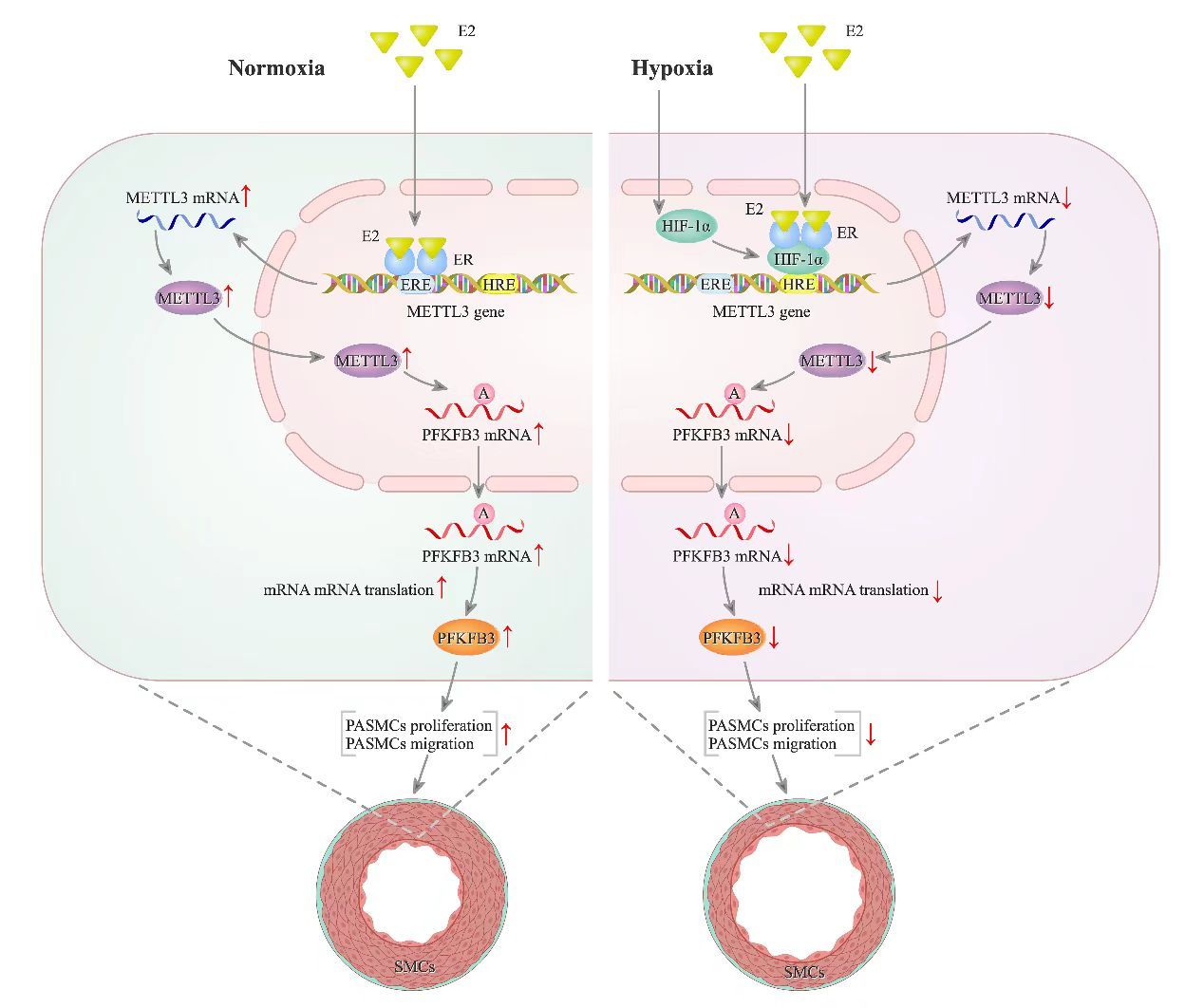 常氧/低氧条件下雌激素反向METTL3/PFKFB3进而逆向调控肺动脉高压发生的信号通路图