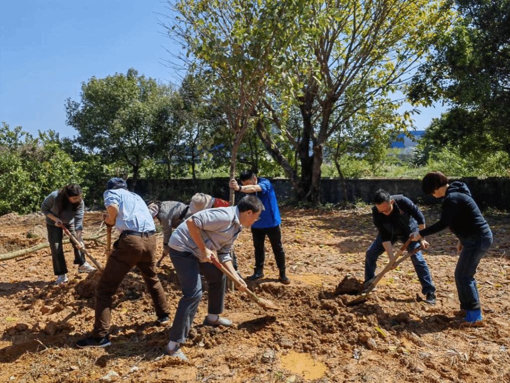 活动现场,大家三五人一组,干劲十足,在炙热的阳光下挥洒汗水。挥锹铲土、扶树填坑、培土加固……大家默契配合,经过一番辛勤劳作,80多株沉香树苗、紫荆树迎风挺立,展现出蓬勃生机,带来了浓浓绿意。