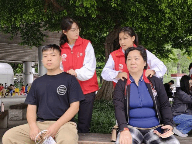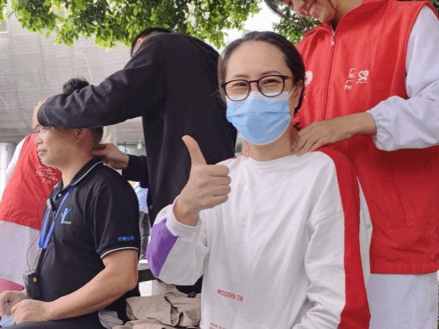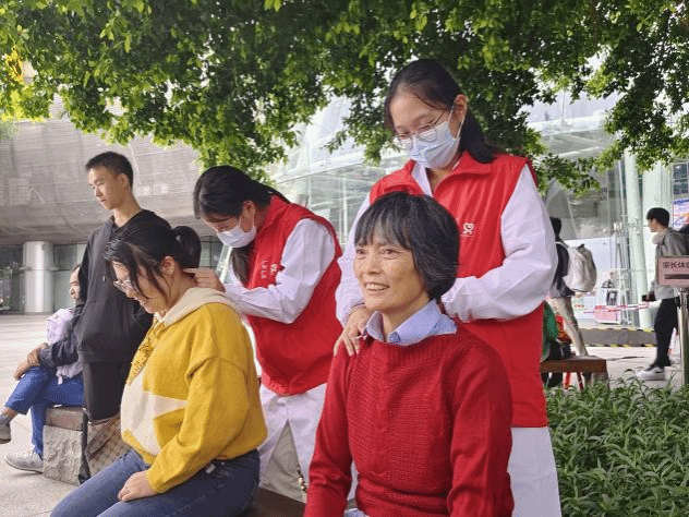 志愿者们迎来第一批市民后便热情地引导他们就座。询问得知市民们需要推拿的部位后,志愿者们分工合作给市民们推拿。