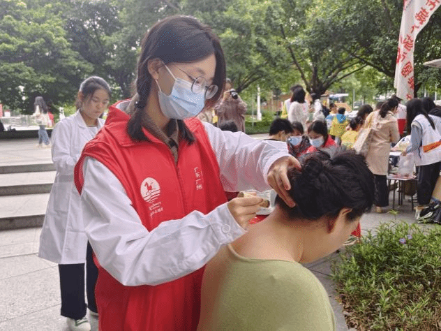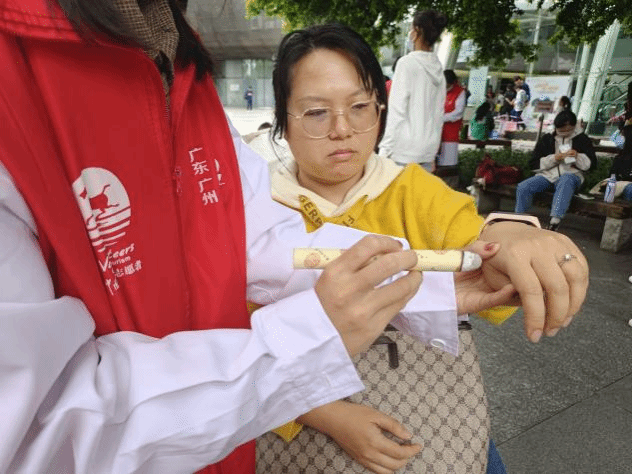 在艾灸摊位,志愿者们为市民们科普艾灸的功效的同时为有需要的市民们进行艾灸理疗。市民们的肩颈、手臂等部位在志愿者们精准到位的艾灸下得到放松,他们不约而同地给出好评,称赞志愿者们的专业性。