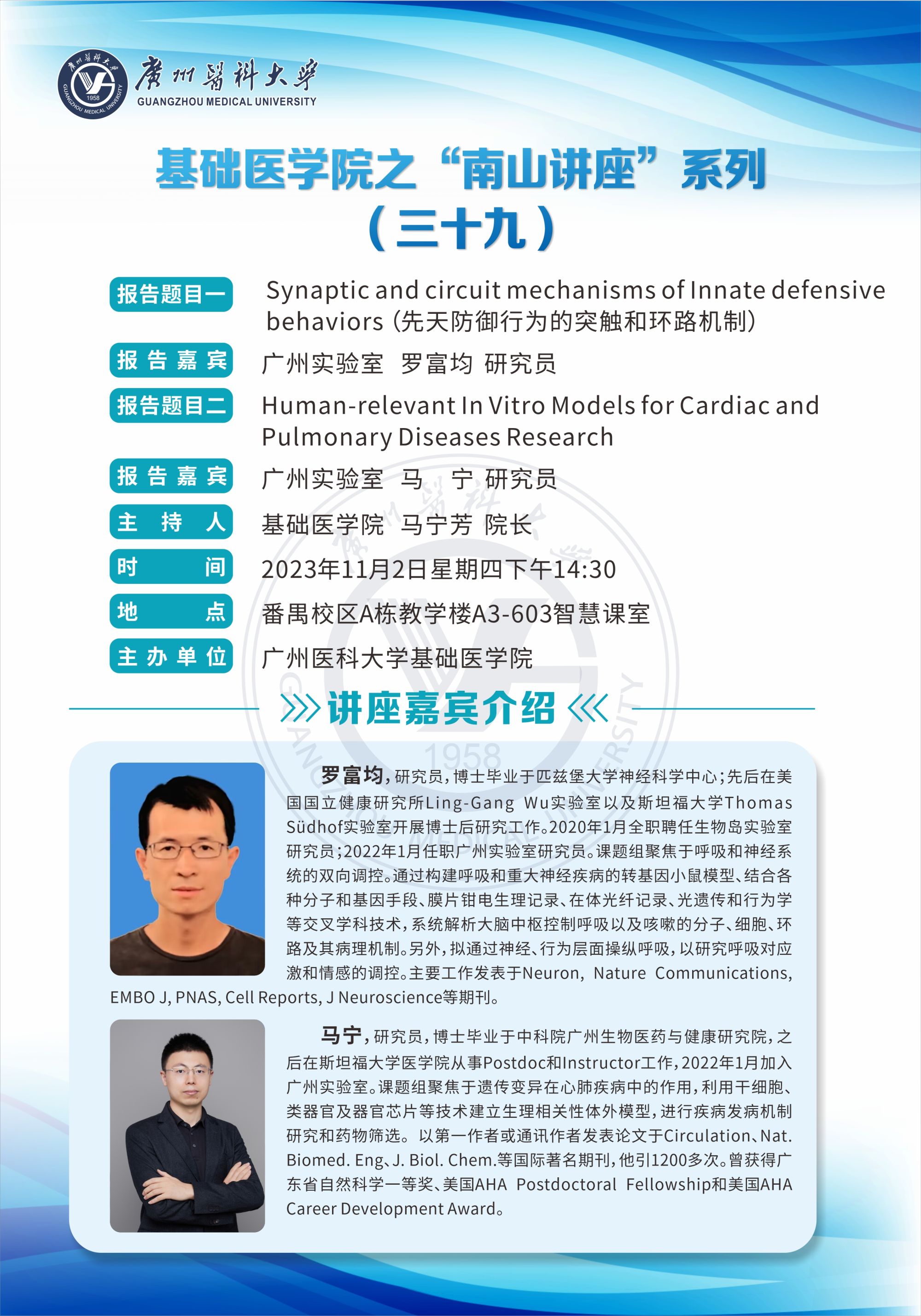 学术讲座--Synaptic and circuit mechanisms of Innate defensive behaviors&Human-relevant In Vitro Models for Cardiac and Pulmonary Diseases Research