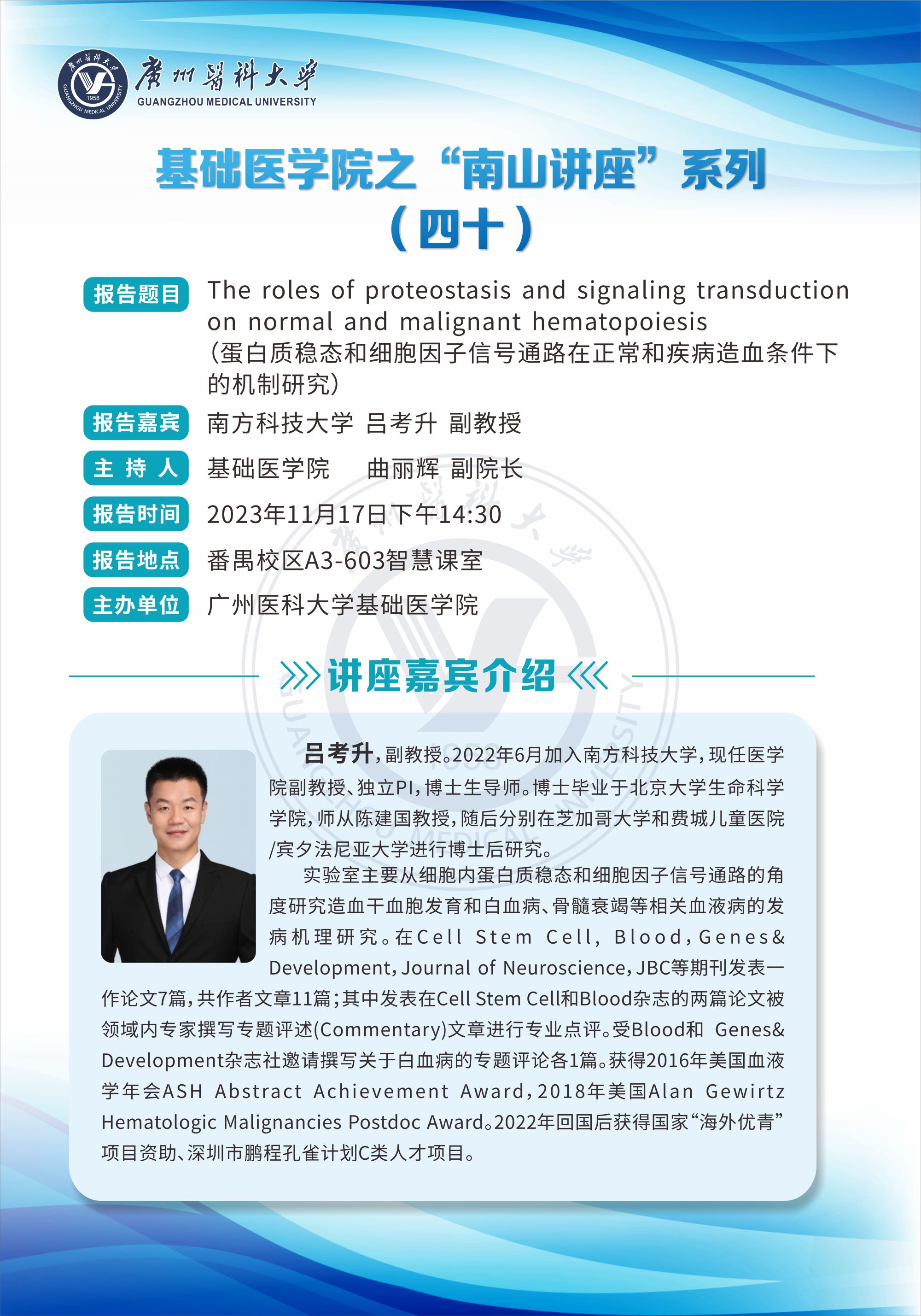 下一篇:学术讲座——蛋白质稳态和细胞因子信号通路在正常和疾病造血条件下的机制研究