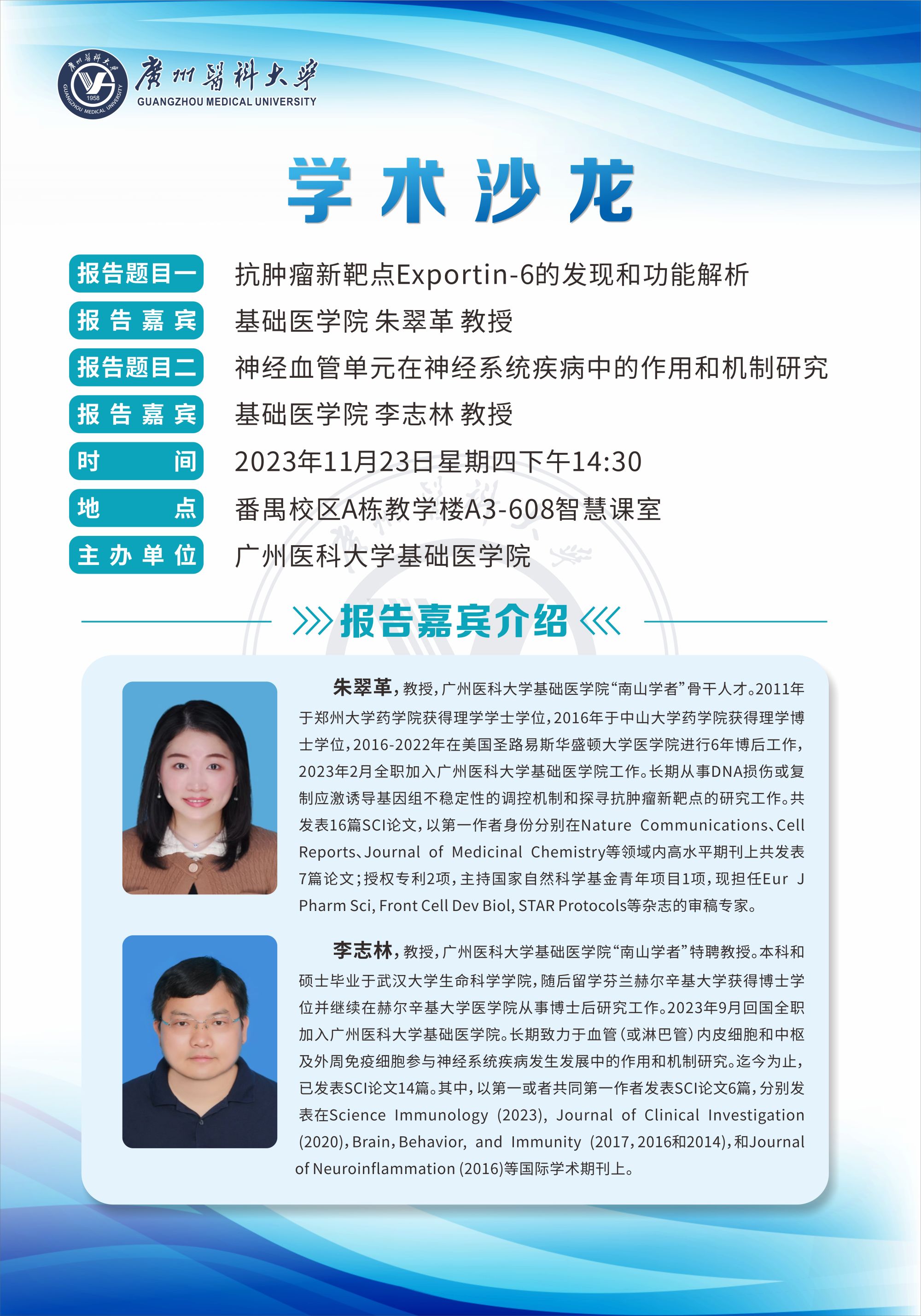 学术讲座——神经血管单元在神经系统疾病中的作用和机制研究&抗肿瘤新靶点Exportin-6的发现和功能解析